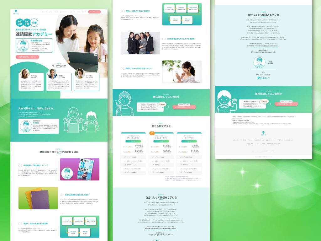 小中学生向けオンライン英会話を題材とした、保護者をターゲットにしたLPということで、若年層向けの教育サービスらしさを念頭にデザインしました。また、コーポレートカラーやFontの指定もありましたので、ガイドラインを逸脱しないよう留意し、その上でターゲットに興味を持ってもらえるような構成・雰囲気作りを心がけました。